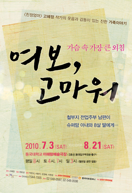 °íÇýÁ¤ ÀÛ°¡ÀÇ ÀÛǰÀº ÀÜÀÜÇÏ°í ¾ÖÀÜÇÏ°í °¨µ¿ÀÌ ÀÖ´Â ±Øº»À» ¾²´Â °É·Î À¯¸íÇÏÁÒ. ÀÌ °ø¿¬À» º¸¸ç ¿ì¸® °¡Á·ÀÇ ¼Ò¸®¾ø´Â ¿Üħ¿¡ ´ëÇØ ±Í±â¿ïÀÌ°í »ý°¢ÇÏ´Â ½Ã°£À» °¡Á³À¸¸é Á¤¸» ÁÁ°Ú½À´Ï´Ù. ²¿~¿Á ÃÊ´ëÇØ ÁÖ¼¼¿©!!^^