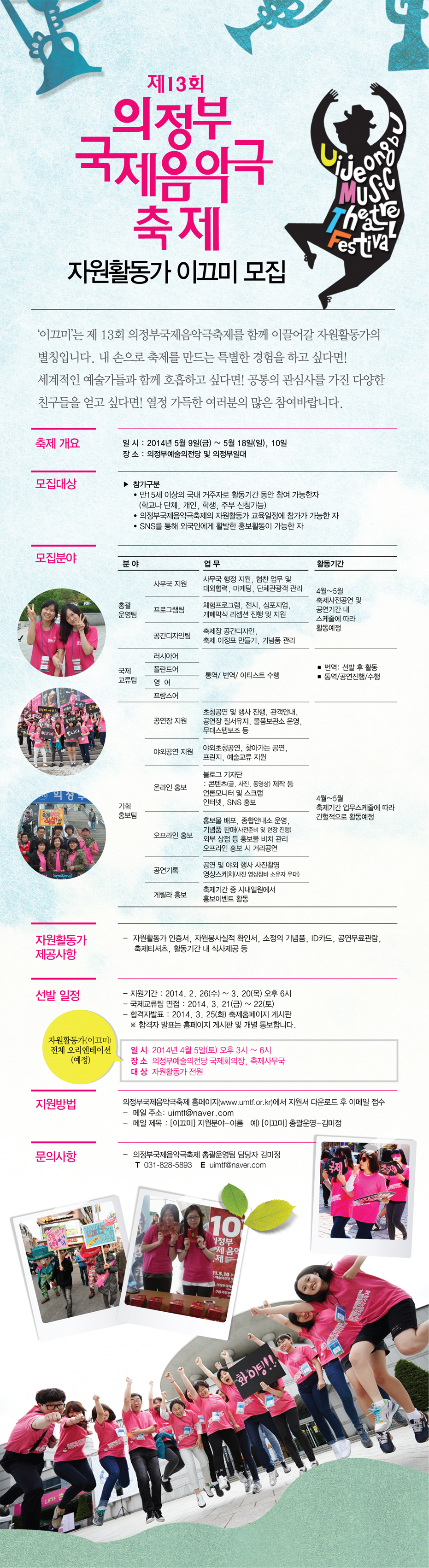 ¡á ÃàÁ¦°³¿ä ◦ ÀϽà : 2014³â 5¿ù 9ÀÏ±Ý ¢¦ 5¿ù 18ÀÏÀÏ, 10ÀÏ ◦ Àå¼Ò : ÀÇÁ¤ºÎ¿¹¼úÀÇÀü´ç ¹× ÀÇÁ¤ºÎÀÏ´ë ¡á ¸ðÁý´ë»ó ◦ ¸¸15¼¼ ÀÌ»óÀÇ ±¹³» °ÅÁÖÀڷΠȰµ¿±â°£ µ¿¾È Âü¿© °¡´ÉÇÑÀÚ Çб³³ª ´Üü, °³ÀÎ, Çлý, ÁֺΠ½Åû°¡´É ◦ ÀÇÁ¤ºÎ±¹Á¦À½¾Ç±ØÃàÁ¦ÀÇ ÀÚ¿øÈ°µ¿°¡ ±³À°ÀÏÁ¤¿¡ Âü°¡°¡ °¡´ÉÇÑ ÀÚ ◦ SNS¸¦ ÅëÇØ ¿Ü±¹Àο¡°Ô Ȱ¹ßÇÑ È«º¸È°µ¿ÀÌ °¡´ÉÇÑ ÀÚ