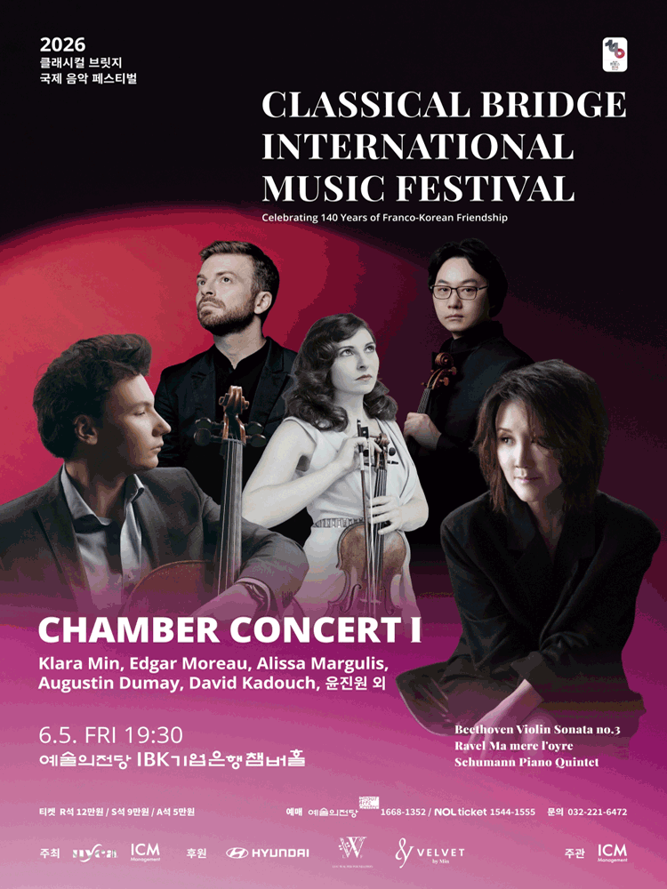 L. v. BeethovenViolin Sonata No.3 in E Flat Major, Op.12 No. 3Vn. ¿À±Í½º¶¥ µÚ¸ÞÀÌPf. Ŭ¶ó¶ó ¹Î M. RavelMa Mere L'Oye, M.60Pf. Ŭ¶ó¶ó ¹Î, ´Ùºñµå Ä«µÎ½¬ R. SchumannPiano Quintet in E Flat Major, Op.44Vn. ¾Ë¸®»ç ¸¶¸£±¼¸®½º, ¿¡¸¯ ½Ç¹ö°ÅVa. À±Áø¿øVc. ¿¡µå°¡ ¸ð·ÎPf. Ŭ¶ó¶ó ¹Î